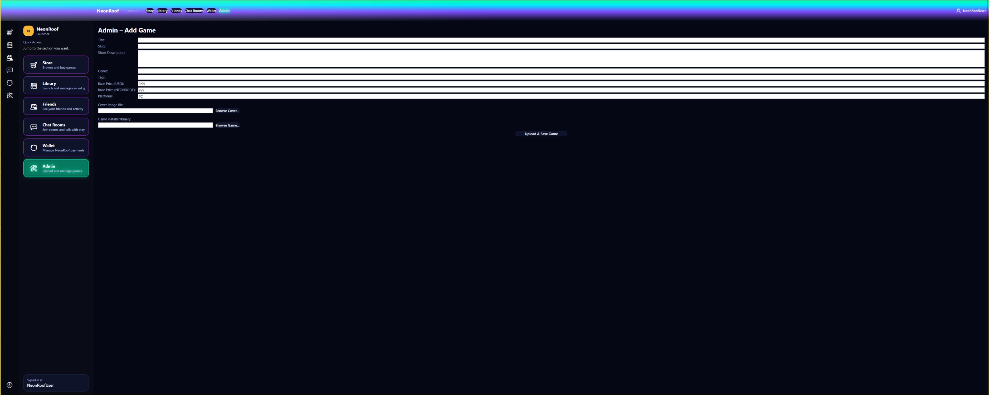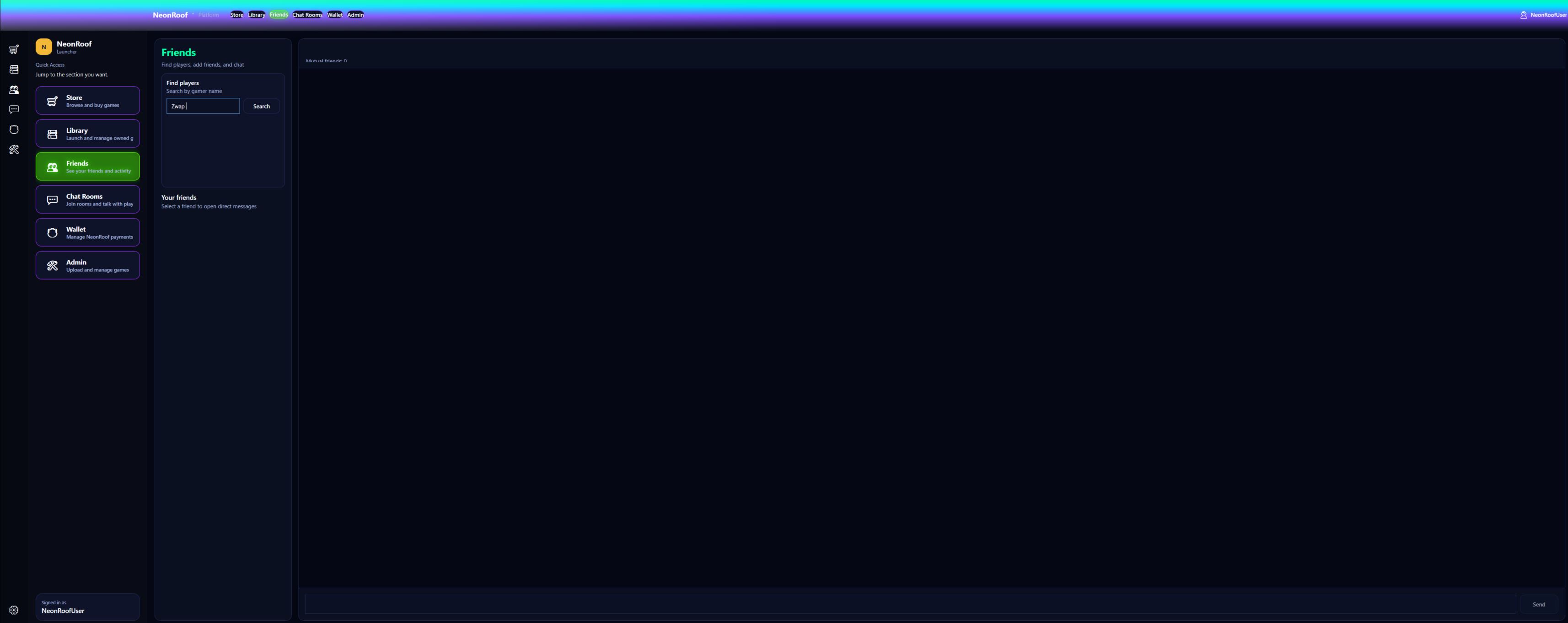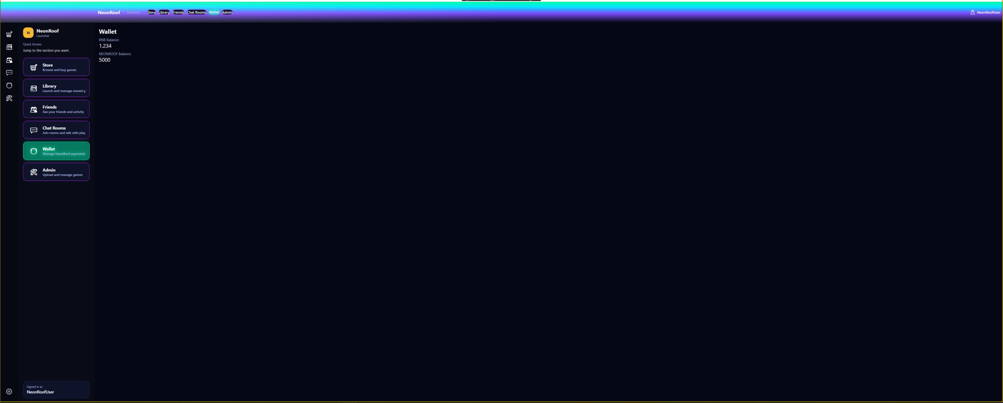 Explore the NeonRoof interface through a scrolling gallery of real WPF platform screens, including store, library, chat, friends, wallet, and admin views.
